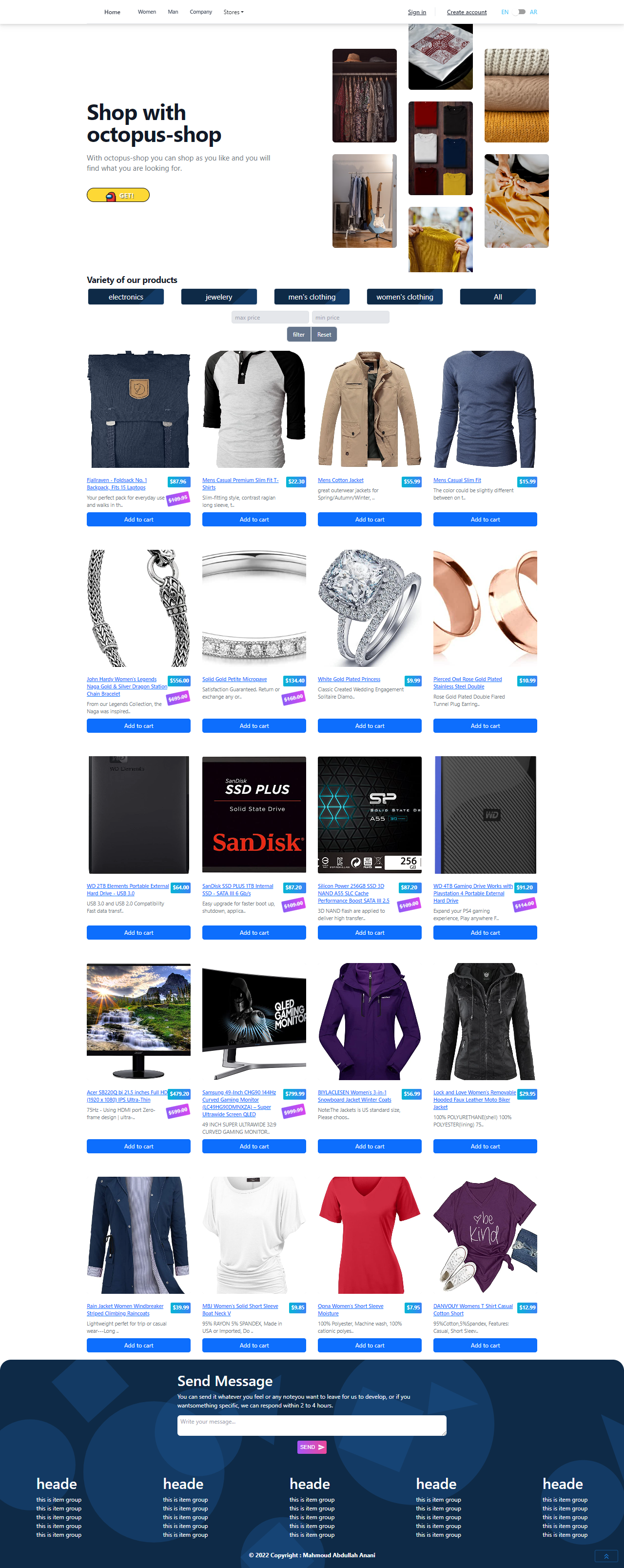 octopus-shop Octopus-Shop is a versatile e-commerce platform designed to offer a wide range of products, from clothing to electronics, all in one place. Developed using Next.js for the frontend, the platform provides a fast, SEO-friendly user experience, ensuring smooth navigation and product discovery. The backend was powered by Node.js, Express.js, and MongoDB, enabling a scalable and robust system for managing products, orders, and users.